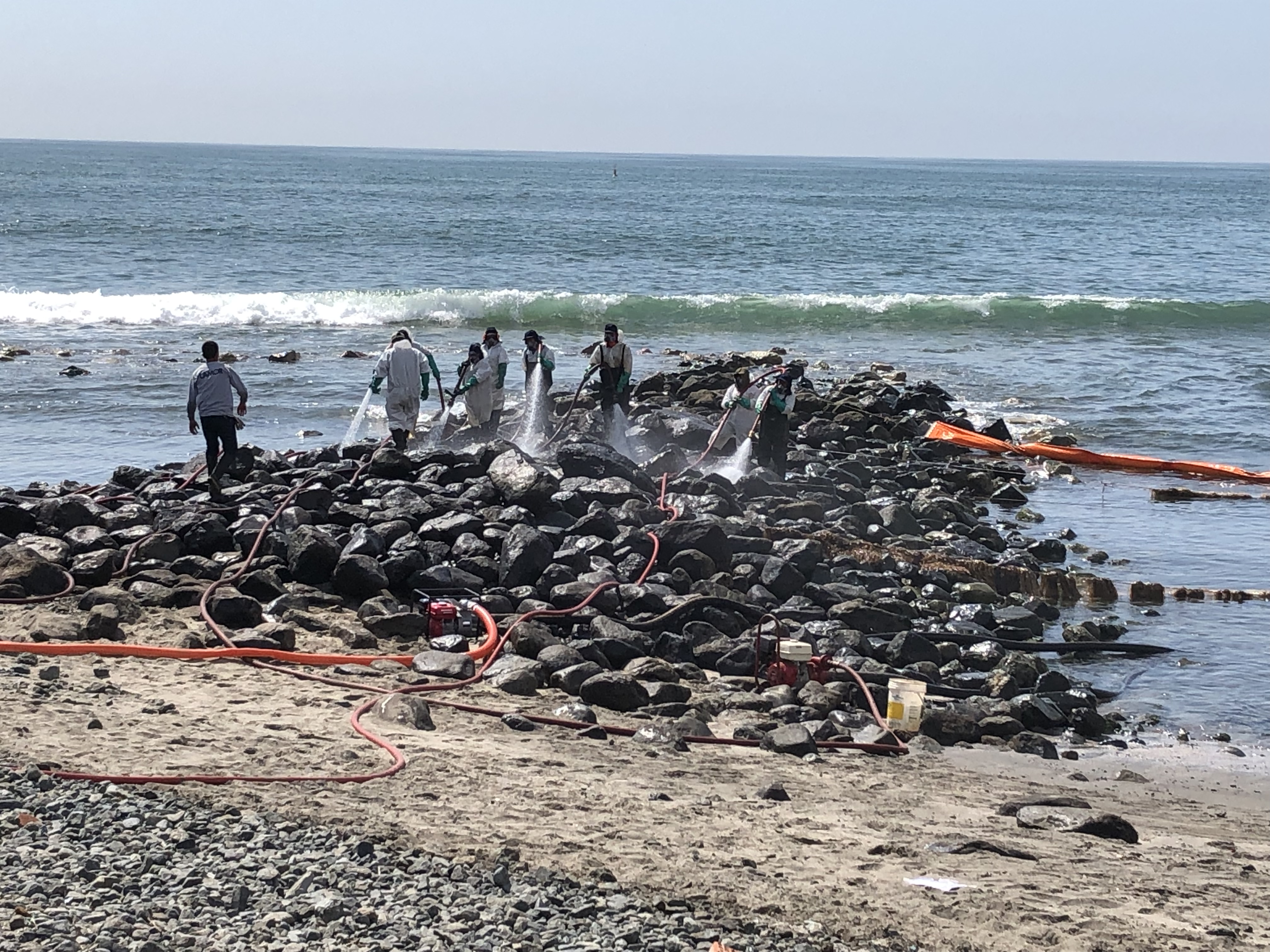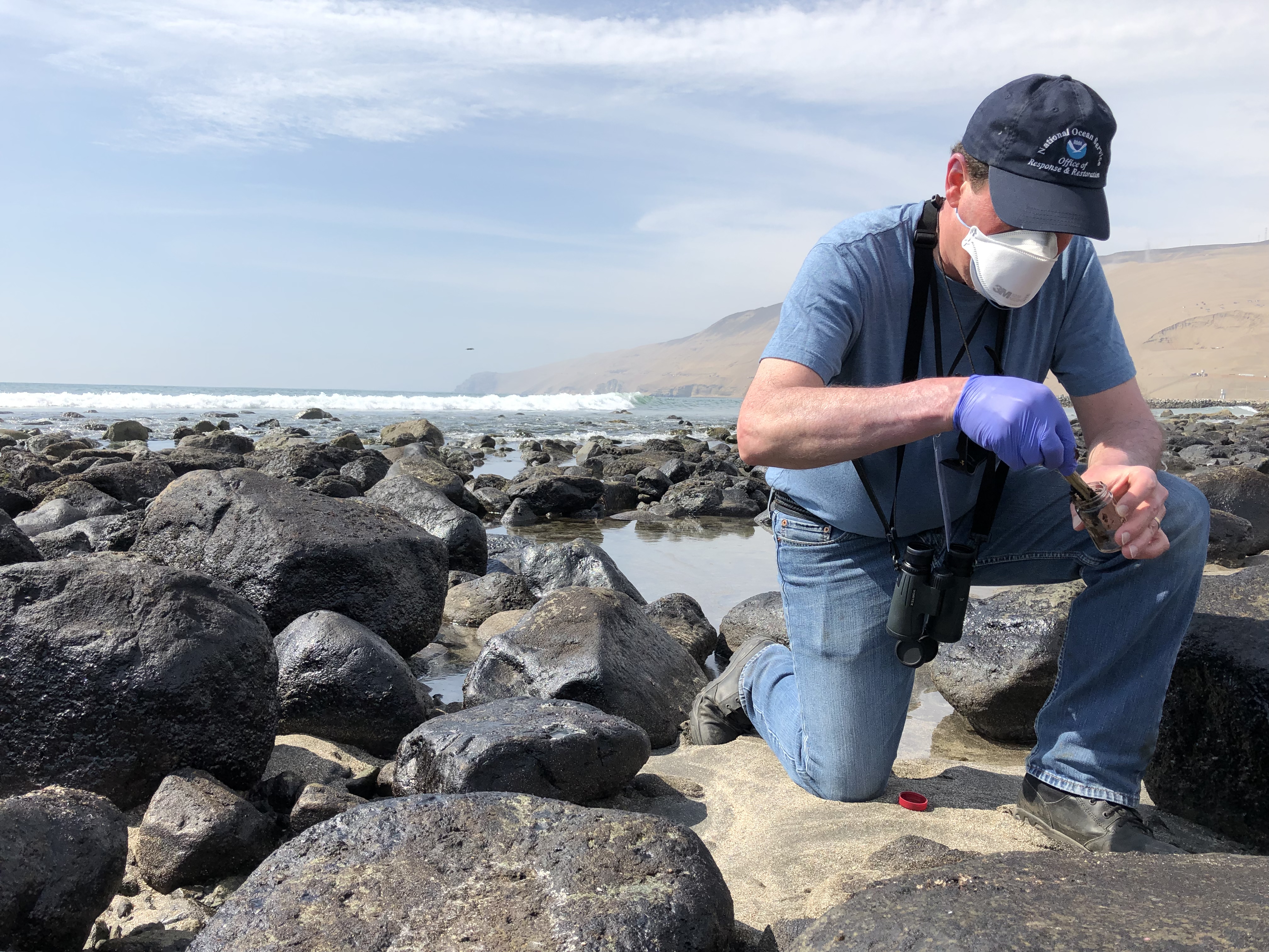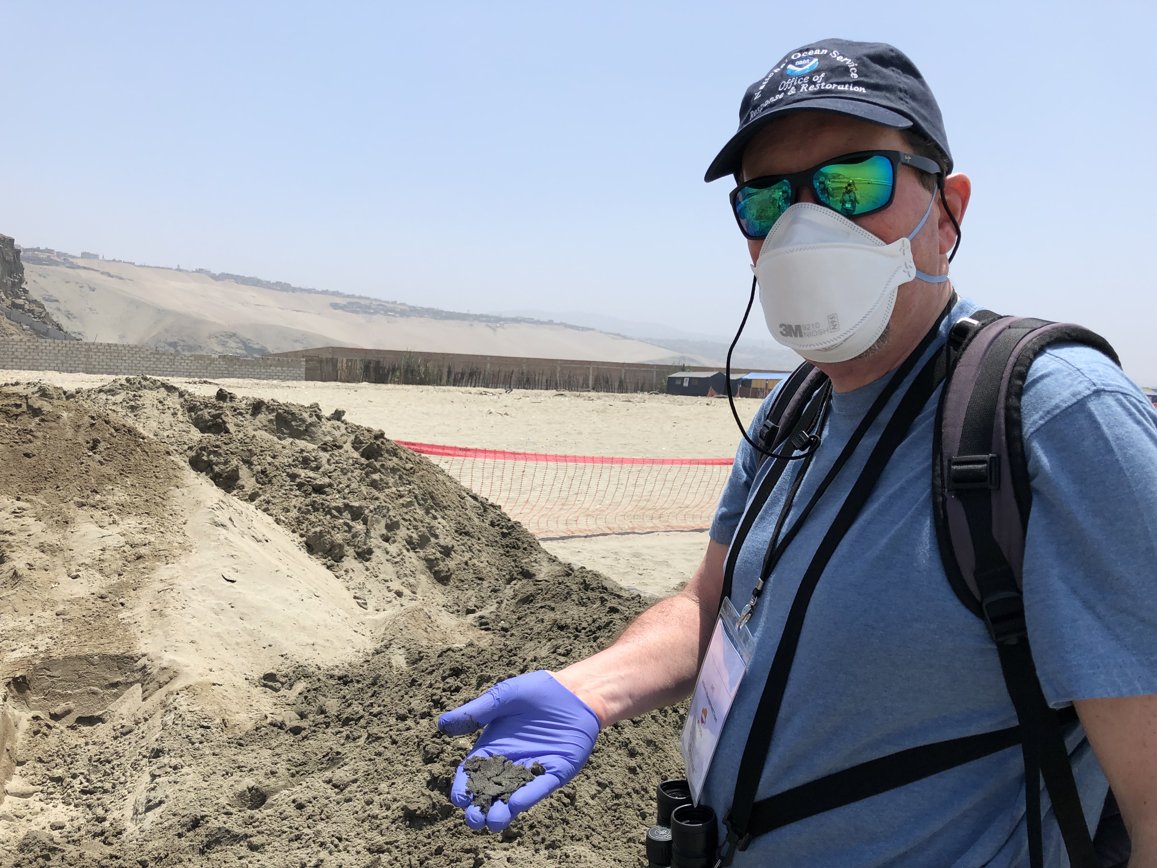 Feb. 22, 2022 — On Feb. 2, two oil spill response specialists from NOAA's Office of Response and Restoration—John Tarpley, response operations branch chief of the Emergency Response Division, and Brandi Todd, scientific support coordinator—joined the U.S. National Response Team deployed to Lima, Peru to support the Peruvian government’s response to a spill that occurred Jan. 15 at an oil refinery off the coast of Callao. Twenty-four beaches have been impacted, with five natural reserve areas threatened. The spill also threatens commercial and artisanal fisheries, and the tourism industry.